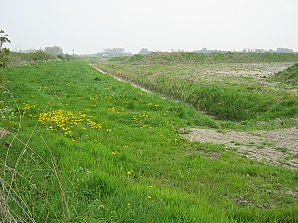 Het Datemaland aan de zuidkant van de spoorbaan (links in de verte een Arrivatrein). Nog steeds kan het land niet worden voorzien van de teeltlaag, het is te nat, de machines (zware krengen, pardon, dingen…) zakken weg….