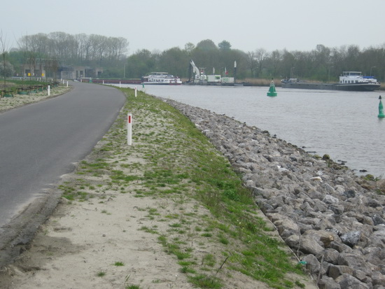 Kanaalweg met nieuwe beschoeiing van het verbrede Van Starkenborghkanaal. De “Con Zelo” ligt te wachten, het werkeiland moet eerst naar een werkbare positie. Kijk, groene bakens! (Betekenis? Is het hele kanaal. over de volle breedte, nu ‘vaarveilig’??!)