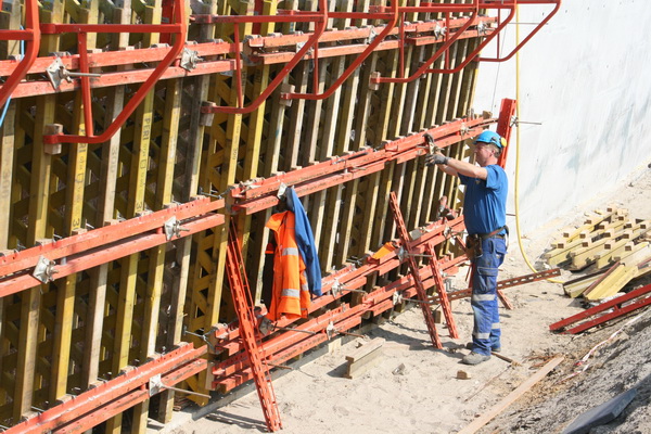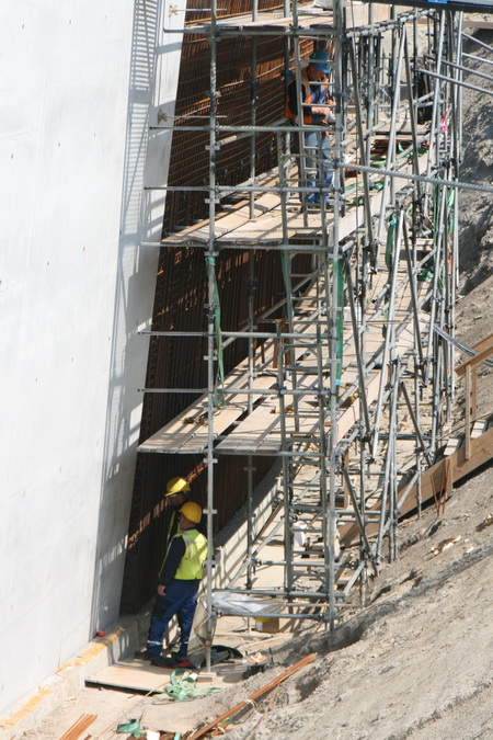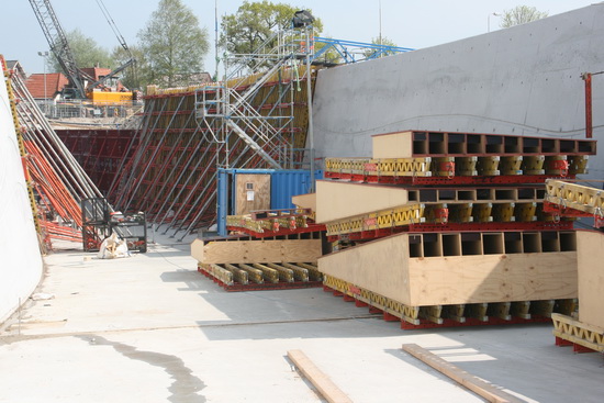 Halverwege de tunnelbouwput, bij moot 5, waar de binnenbekisting is aangebracht. Volgt de wapening aan de buitenkant van de bekisting, daarna aan de buitenkant bekistingselementen er tegenaan. En dan kunnen ook hier de betonauto’s voorrijden…. Maar dan is het al wel week 20, denk ik, of 21….