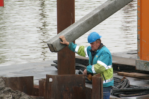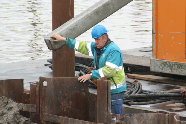 Terug naar gisteren, 30 april jongstleden. Naar de bouwput van de NVH-brug, aan de zuidzijde. Verder met het transporteren van een zware betonnen ligbalk door timmerman-kraanstuurman Jan naar het binnenste van de damwandkuip bij de zuidelijke pijler: