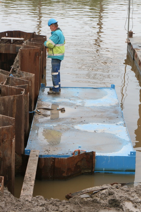 Goed om even te laten zien waar vandaan stuurman Jan zijn handelingen verricht. Vanaf een GMB-vlot dat tegen de oostkant van de damwandkuip ligt aangedrukt, bereikbaar via een glibberige oeverkant en smalle loopplank. Overmoedig dacht ik daar ook wel wat foto’s te kunnen gaan maken, maar van gladde hellingen naar beneden glijden is niet mijn favoriete bezigheid. Even doemde het schrikbeeld op van een spartelende JB in het kanaalwater die manmoedig probeert zijn Canon boven water te houden…. Voldoende aanleiding op mijn schreden terug te keren. Naar het binnenste van de kuip dan maar….