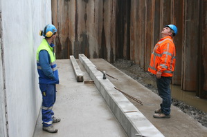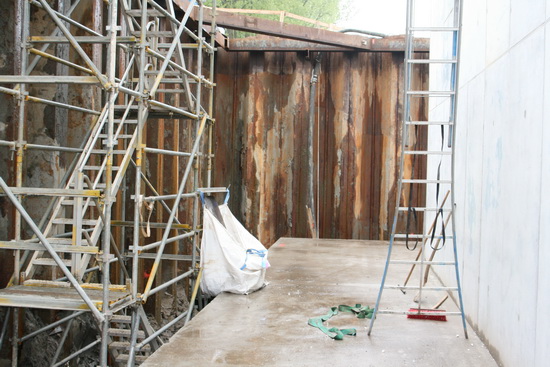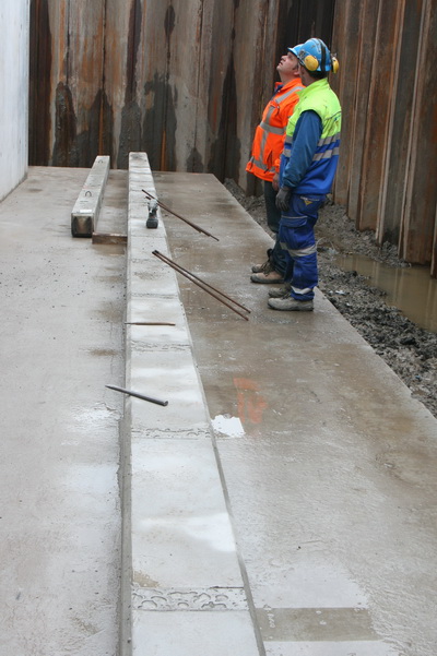 De noordwand van de zuidelijke pijler. Op een van te voren vastgestelde hoogte zitten al gaten voor de schroefstangen die worden gebruikt om de blijvende damwand vast te maken.
