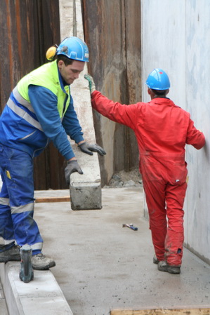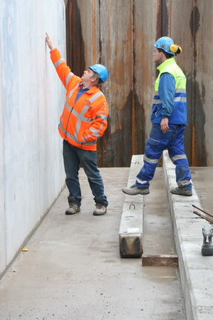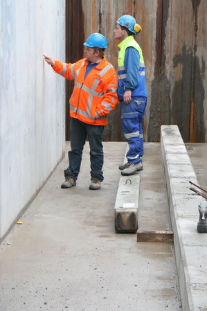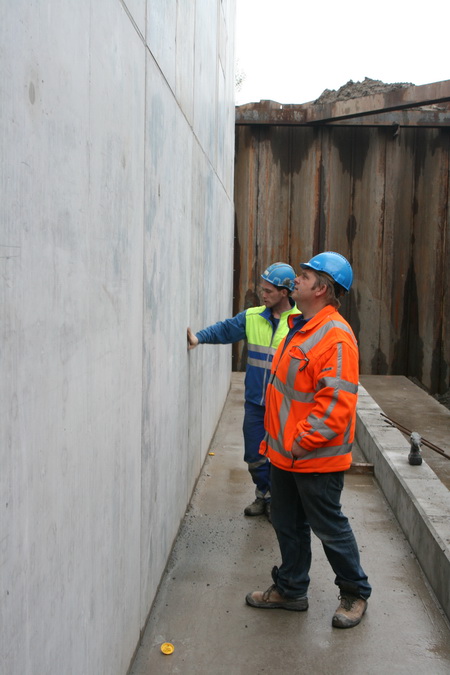 Uitvoerder Johan bekijkt samen met de GMB-timmerman de noordwand van de zuidelijke pijler. Oneffenheden die alsnog dienen te verdwijnen…