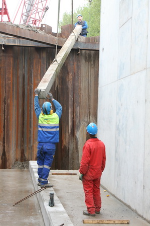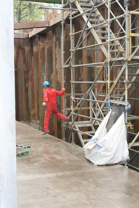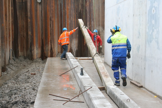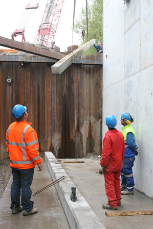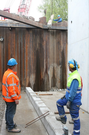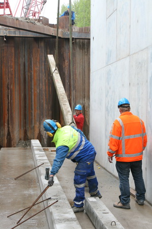 Zojuist een klein Mokkenburgrondje gemaakt. De betonpomp van Faber was in geen velden of wegen meer te bekennen, wel werd er in de tunnelbouwput verder gewerkt aan de wapening van moot 5 en de bijzonder arbeidsintensieve bekisting van moot 6. Het muurtje op de grens van moot 1 en moot 2 is gisteren vervroegd gestort met behulp van kraan en kubel. Hoeft op 2 mei dus niet meer. (De in het weekbericht van de Provincie vermelde betonstort van de wanden van moot 10 is onjuist. Die wanden hebben al beton…) Woensdag 30 april jongstleden, onderin de damwandkuip van de zuidelijke pijler, fotoreeks deel 3: