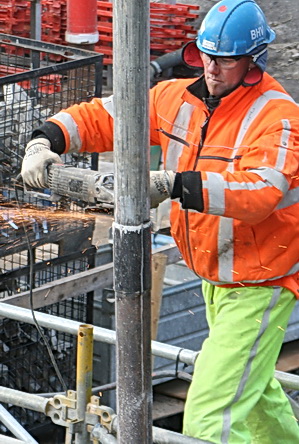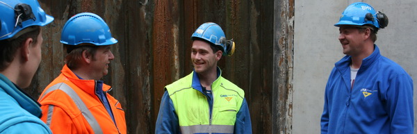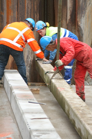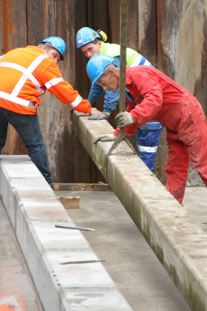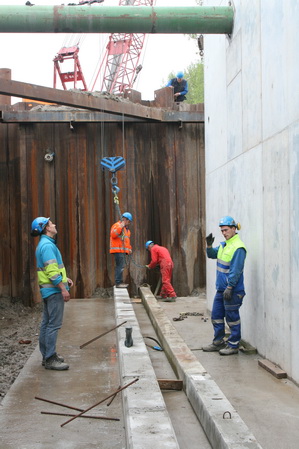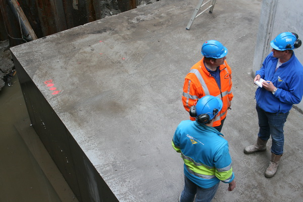 Werkoverleg van drie uitvoerders op het fundament van de zuidelijke pijler. Zo’n concrete omgeving inspireert bouwers. Altijd maar voor het computerscherm, dat’s ook niet alles…