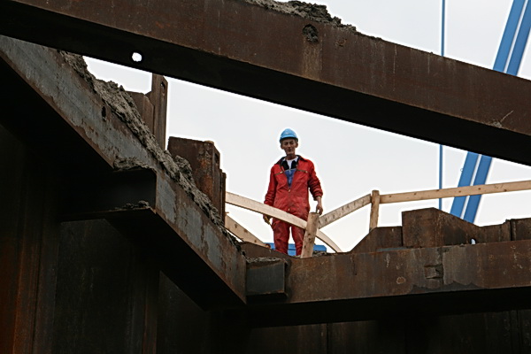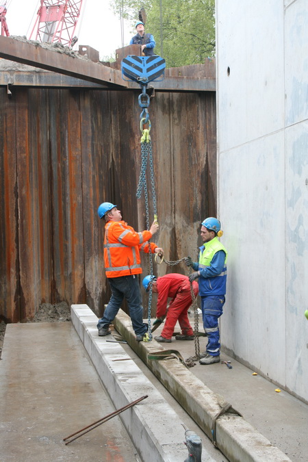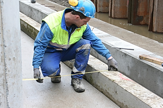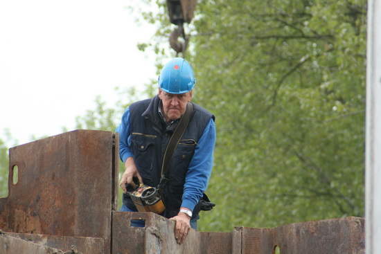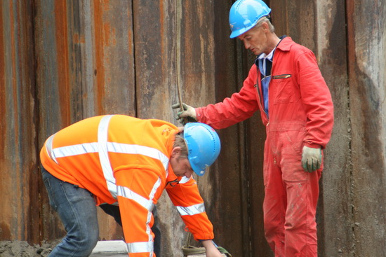 Kraanstuurman Jan kijkt nog eens kritisch naar het transportresultaat, beneden op het pijlerfundament! “Dat hebben we toch maar mooi weer voor elkaar gekregen!”