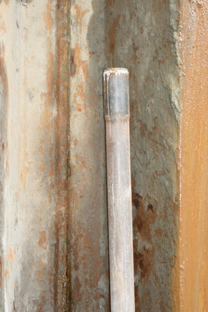 Links de afgezaagde buis op 30 april, rechts het doorzagen van de buis door voorman Jeffrey op 15 april…..