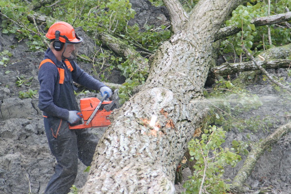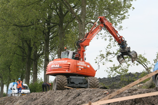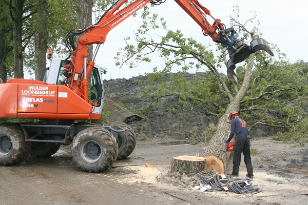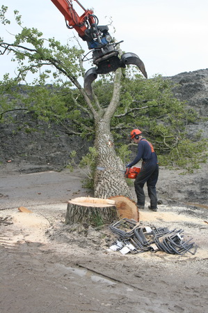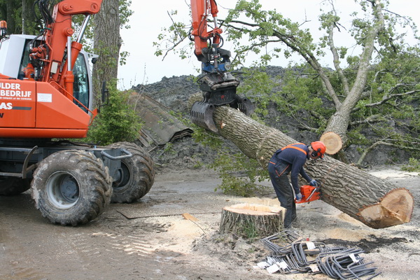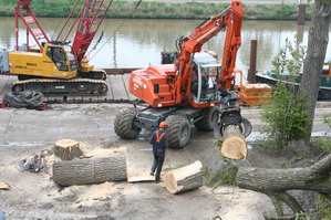 We hebben de damwandkuip bij de pijler verlaten en kijken naar het vellen van een in de weg staande populier. Fluitje van een cent (nou ja, een paar euro’s meer…) voor grijper en zager….