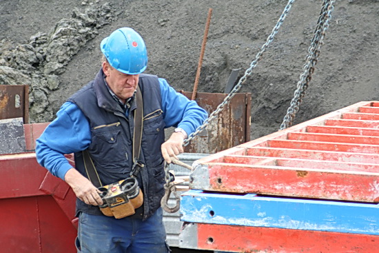 Timmerman-kraanstuurman Jan heeft intussen een nieuw vrachtje voor zijn “blauwe reiger”, de met het kastje te besturen kraan: Bekistingselementen…