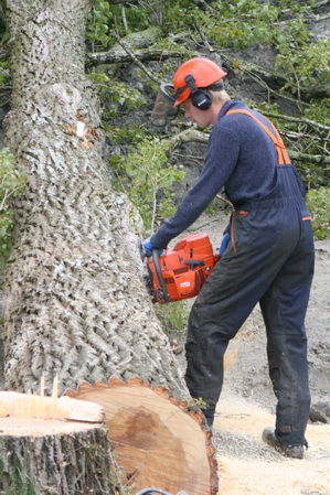 Met zo’n motorzaag wordt een Mulder-medewerker een snelle beul. Vroegere beelden van twee handzagers die aan weerskanten van de stam met een lange zaag de boom in stukken verdeelden, kennen veel mensen niet eens (meer)…