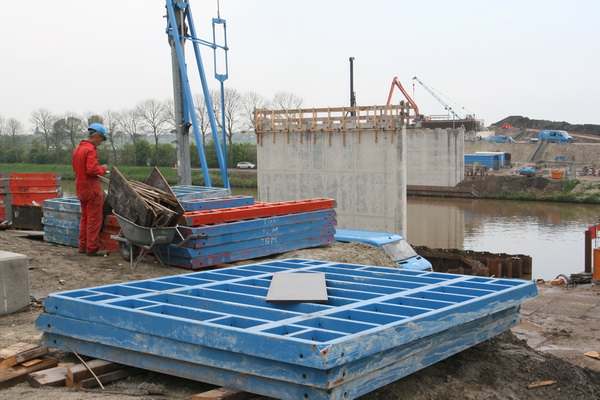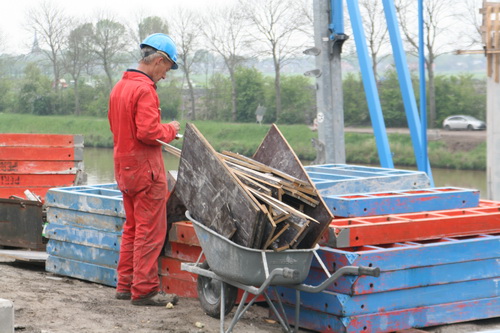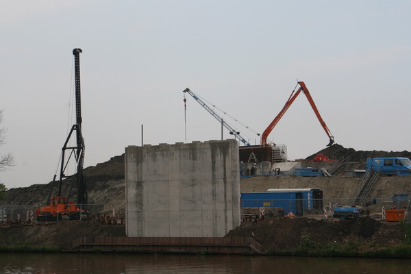 Ter afwisseling de lens gericht op de overkant, waar de noordelijke pijler al langere tijd staat te ‘pronken’…. Links van de pijler dreunt de hei-installatie van KNOL de boomstammen de grond in voor het maken van platforms voor de telescopische kranen die de liggers komen plaatsen aan het eind van week 21: 22, 23 en 24 mei… Op de heiplaatsen met boomstammetjes wordt nog beton gestort. Als de kranen hun werk hebben gedaan, worden de platforms weer verwijderd….