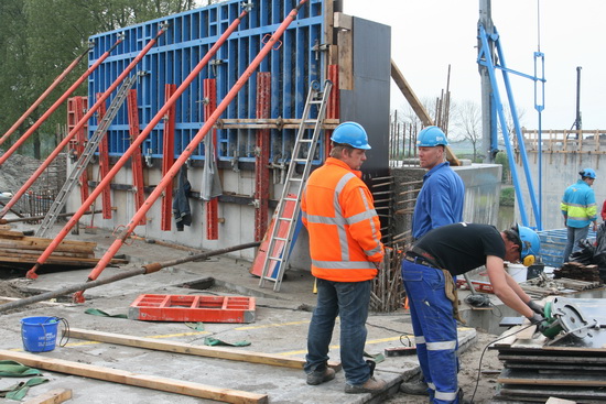 Situatie bij landhoofden en pijler aan de zuidelijke oever. Vier bezige mensen, ieder op zijn manier…. Stuurman Jan laat de kettingen neer van de kraan; de timmerman in zijn rode overall bestudeert nogmaals zijn papiertje, timmerman JH maakt een plank(je) pasklaar; en uitvoerder Kees Kranenburg belt… (Wat zou een uitvoerder zijn zonder GSM? Onthand…)