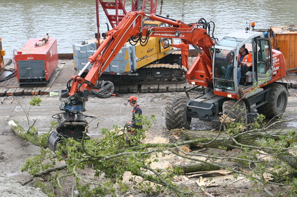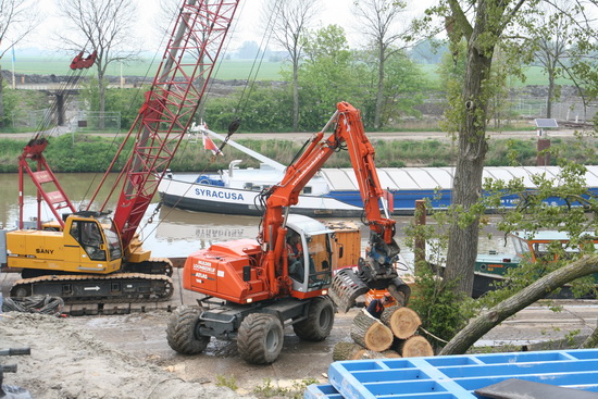 Hier wekt de foto de indruk alsof de grijper de kant van de populier heeft gekozen en het heeft voorzien op de motorzager….. In het kanaal de “Syracusa”, ook een van de grote binnenvaarders die hier regelmatig voorbijkomen.