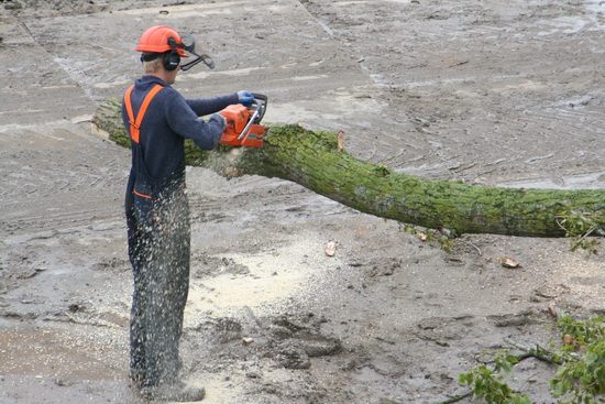 De motorzager gaat doelbewust verder, zaagsel vormt de nieuwe bodembedekking….