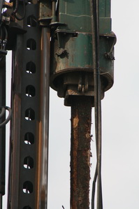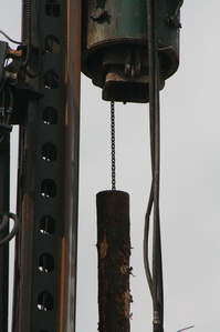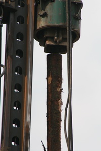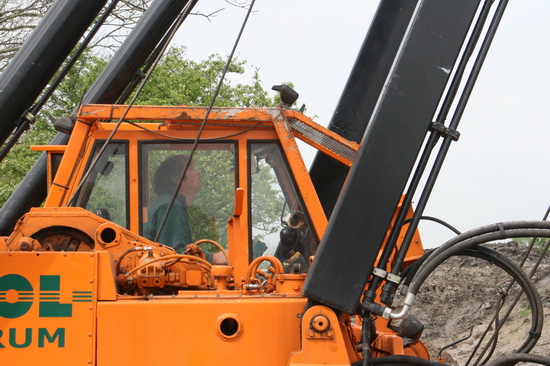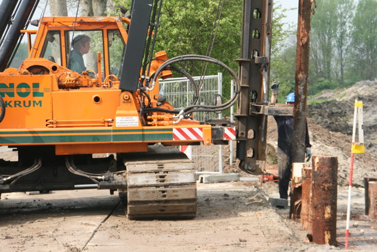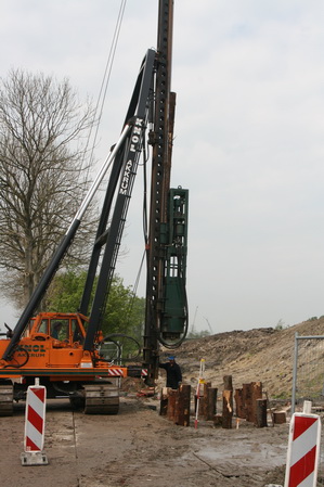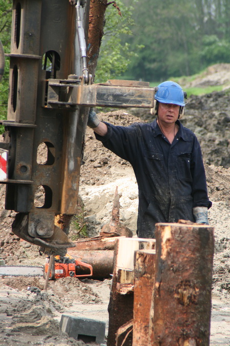 We zijn met de Skoda van Johan van zuid naar noord gereden en staan nu bij de heimachine van Knol die boomstammen als heipalen gebruikt voor de tijdelijke kraanplatforms.