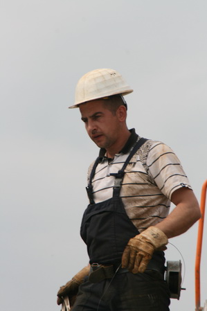 Links het uiterste bereik met mijn Tamronlens: GMB-timmerman in zomerse werkkleding op landhoofden. Rechts het totaalplaatje met een voorbijvarende plezierboot…