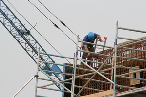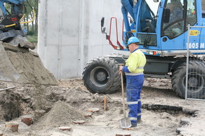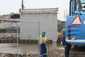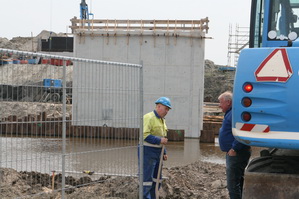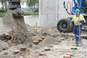 Aan de oostkant van de noordelijke pijler wordt een van de platformen waarop in week 21 een telescoopkraan komt te staan, geëgaliseerd met speciaal zand. Er zitten al stammetjes in geheid. Er komt nog beton bovenop.. (En na het werk van de vier kranen kunnen de zestien platformen weer worden verwijderd).