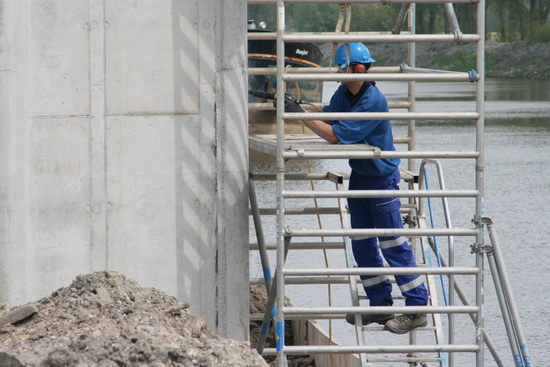 Aan de kanaalkant van de noordelijke pijler wordt de buitenzijde systematisch gecontroleerd en eventueel bijgewerkt. Of gebeurt er nog meer? (Nee, je moet hier niet een misstap maken…)