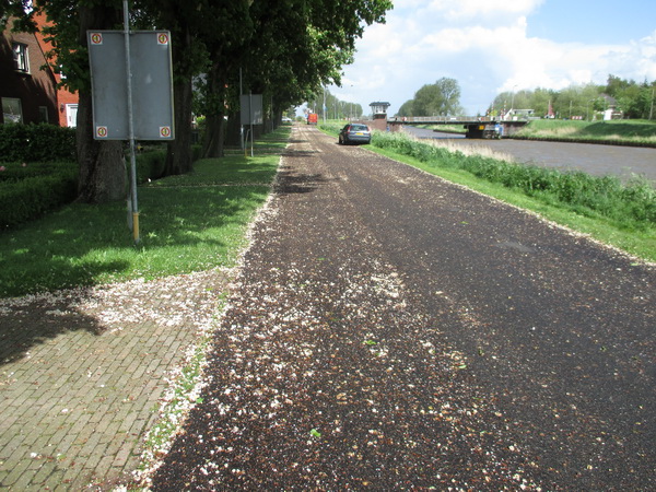 De harde wind slachtoffert de kastanjebloesems van de bomen langs de kanaalweg. Vroeg in het seizoen ‘nieuwe’ vloerbedekking….