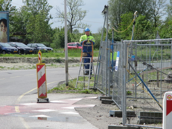 Voorman Arjan verhelpt een gebrek aan het hek, geassisteerd door stagiaire Tim…