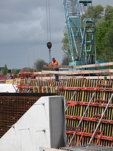 Een groot tunnelcomplex waar op dit vrijdagmiddagmoment niet veel tunnelwerkers zichtbaar zijn. Vooraan de donderdag gestorte wanden van moot 5. Betontimmerman Alje Kamminga is op de achtergrond bezig met het timmeren van een leuning langs de omloop bij moot 6. Daar komen komende donderdag 15 mei de betonstorters in actie…