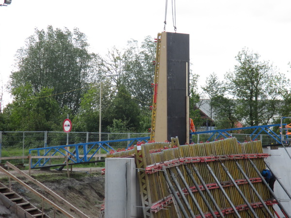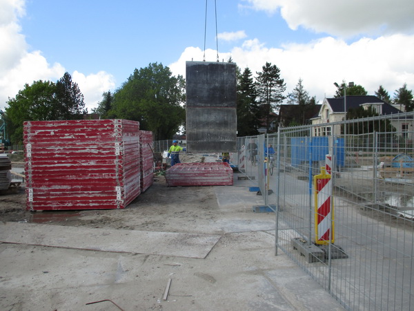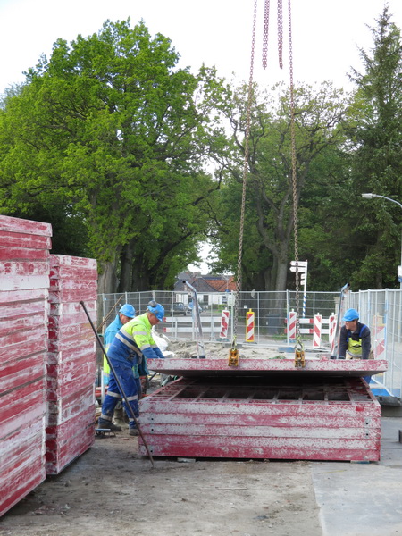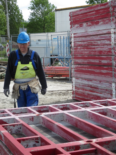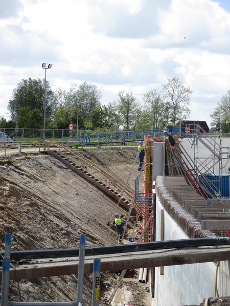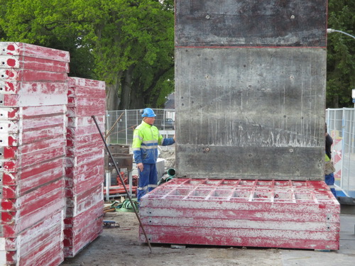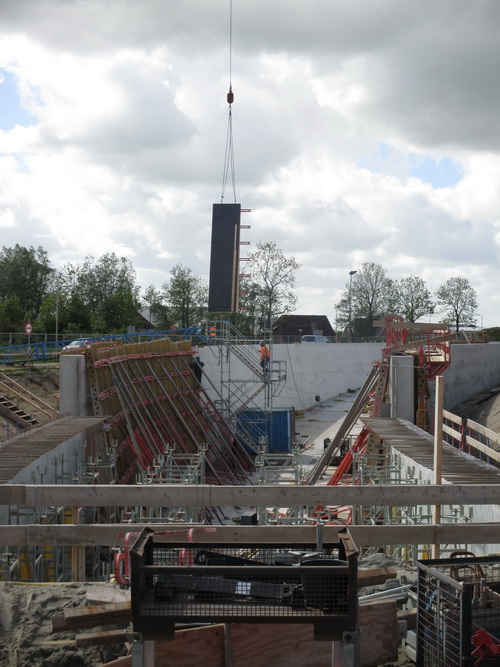 Ja, hiermee was ik de eerste reeks van vandaag geëindigd: Het weghalen van de bekisting vanaf de wanden van moot 5. Uit de tunnelkuip op de begane grond naast de ‘noodweg’. Kunnen zo per vrachtauto worden afgevoerd, zijn hier niet meer nodig….
