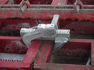 Hier worden speciale bekistingselementen op hun plaats getild bij moot 6… Op de trap betontimmerman Alje.