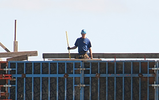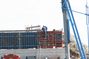 Niet fit en toch in de zevende hemel! Mijn gemoedstoestand van vanmiddag vroeg. “Kom maar tegen een uur of een”, aldus uitvoerder Johan van Veen, “kunnen we dan wel even naar boven, met de manbak!” Eerder deze week hadden we contact gehad over de mogelijkheid de bouwplaats (en het dorp) eens ‘van boven’ te bekijken en te bekieken. Ook kraanmachinist Bertus vond dat het net iets voor mij zou zijn, met het fototoestel erbij! Ik had zo mijn bedenkingen. Hoogtevrees? Nou, in ieder geval wel iets wat daarbij in de buurt komt…. Maar goed, de klim naar de top van de zuidelijke pijler ging ook zonder problemen en de toezegging dat Johan mee zou gaan trokken me over de streep.