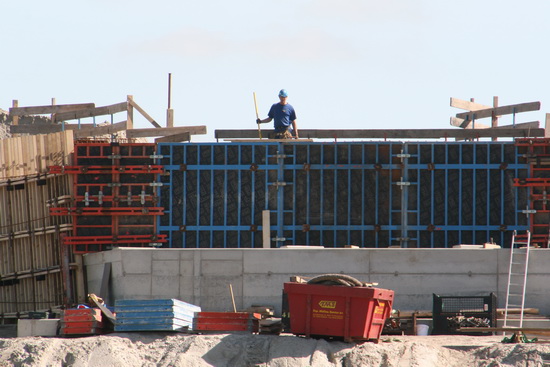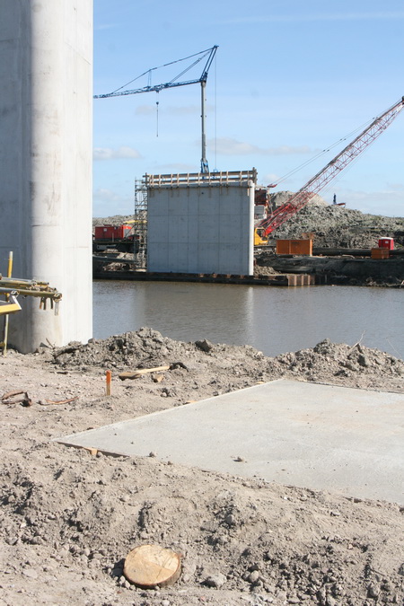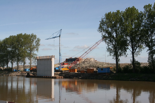 Half vijf ’s middags en nog steeds wordt er gewerkt bij de noordelijke landhoofden. Als het is gelukt, is er vandaag (16 mei) beton gestort, zowel voor kraanplatformen aan de zuidkant bij de pijler, als bij de landhoofden. Alleen aan de bovenkant van de landhoofden komt nog beton, maar dat kan pas als de liggers zijn geplaatst/