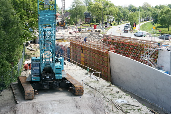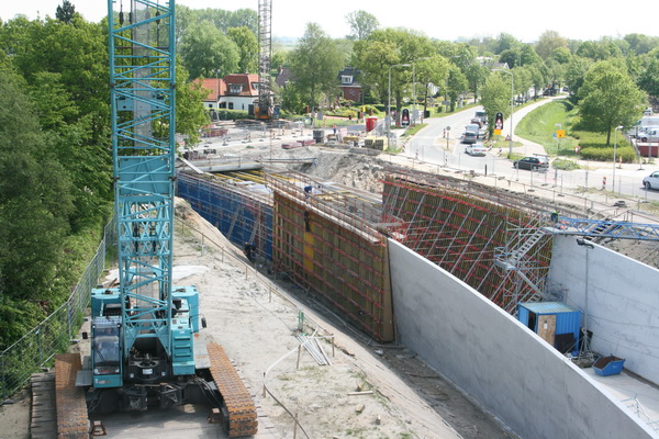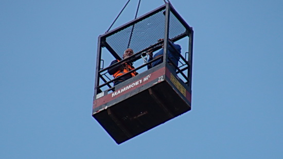 Nu de aandacht gericht op het avontuur met de manbak, op vrijdagmiddag 16 mei jongstleden bij het tunnelcomplex, toen we de hoogte ingingen tot een maximale afstand van 65 meter… Aan de kraan van kraanmachinist Louis, met uitvoerder Johan van Veen als metgezel! Eerst twee foto’s uit het filmmateriaal van Dirk Vos, die na ons met uitvoerder John Noordhorn van bovenaf bekeek. Ter staving….: