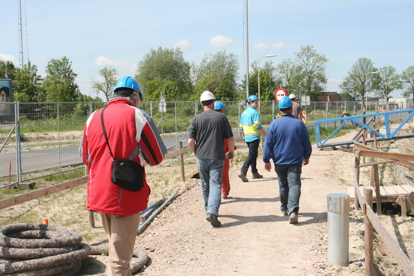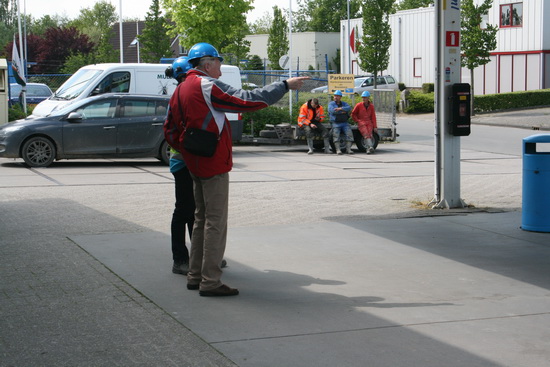We zijn er klaar voor! Hobbyfilmer Dirk Vos is ook gehelmd aanwezig, samen met zijn GMB-begeleider John, die iets van uitvoeren weet. Zij komen na Johan en mij aan de beurt, maar Johan is nu nog aan de telefoon. (Het werkend leven van een uitvoerder bestaat voor een belangrijk deel uit communicatie via de GSM…) Op de achtergrond genieten drie ‘echte’ werkers nog even van de pauzezon….