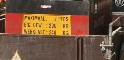 Duidelijk: Johan en ik, 1 + 1…. De solide bak weegt 290 kilo, is grotendeels open, een soort kooi, waardoor de wind er minder vat op krijgt. De werklast mag 240 kg bedragen. Betekent dat, dat we samen niet boven dat gewicht mogen uitkomen? Nou, ik ben ruim 90 kilo, dan kan Johan er probleemloos bij….