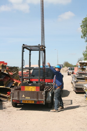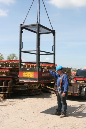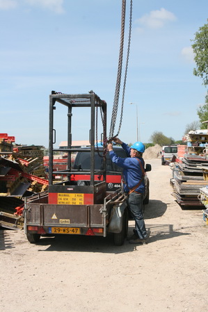 De manbak staat op een aanhanger, moet er uit worden getild. Johan koppelt de kraanketting aan de bak.