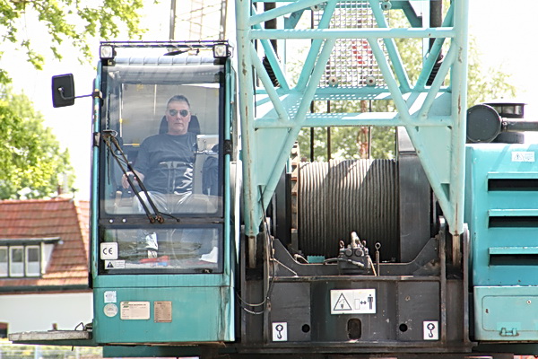 Kraanmachinist Louis geconcentreerd aan de hendels….