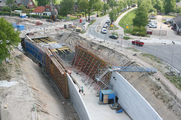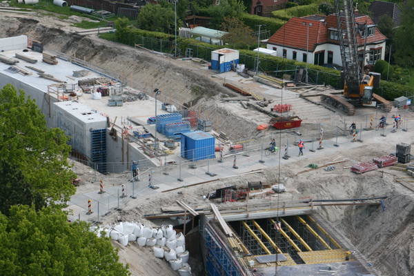 Nog eens de bouwput van de tunnel. Mooi te zien waar het laatste dek wordt gelegd (moot 5), waar eerder de afslag langs liep…