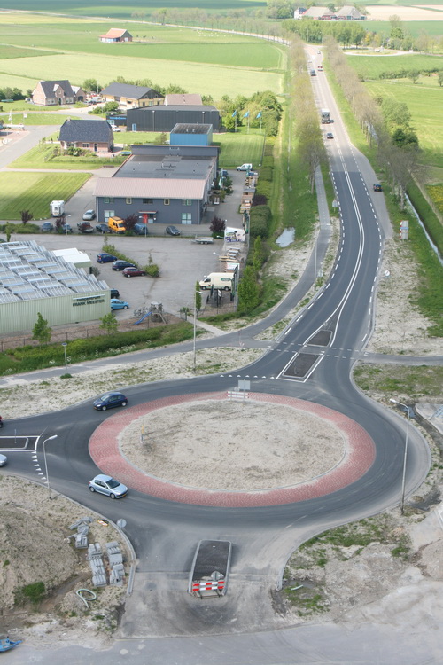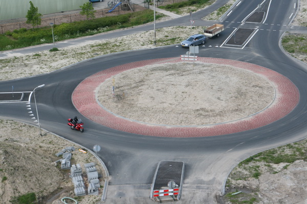 Mooi overzicht van de rotonde met een opvallende motorrijder scherp in beeld.