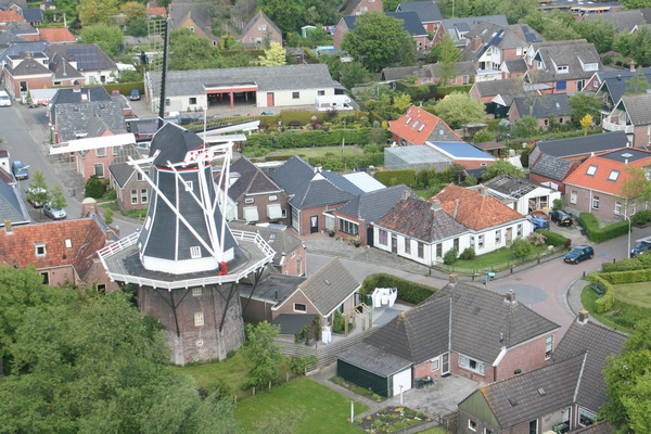 Foto vanuit de manbak, richting het noorden. Koren- en pelmolen “Fortuna” op de voorgrond.