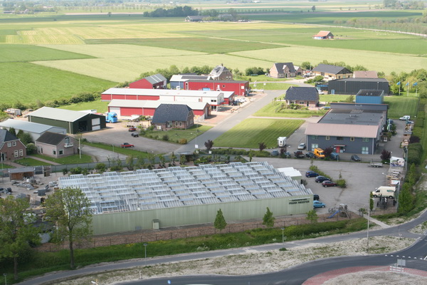 Een blik gericht op de noordwesthoek. Op de voorgrond het Tuincentrum van Frank Meester, verder naar het noorden het Bedrijfsverzamelgebouw (rechts) en bedrijven als H. van der Velde Transport en Boka (Bolhuis). Rechts onder is nog net een stukje van de nieuwe rotonde te zien.