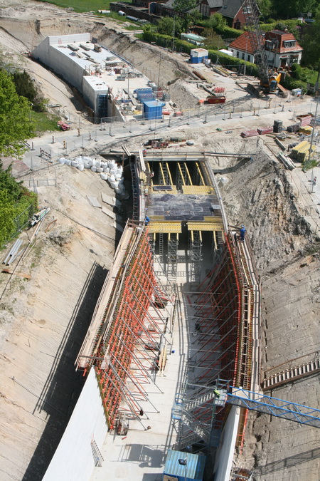 Een groot deel van de tunnelbouwput, van moot 7 op de voorgrond tot en met moot 1, aan het oostelijke eind…. Met de ‘noodweg’ als opvallend, kruisend element…