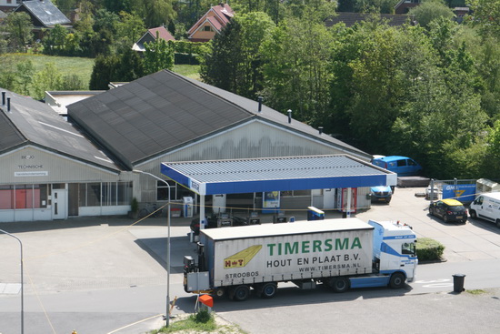 Zicht op het GMB-gebouw, waar een vrachtwagen van Timersma (Stroobos) voor de Tinq-pompen langs rijdt…. Wat gaat er na afloop van dit project Noord/Zuidhorn met het gebouw gebeuren??!