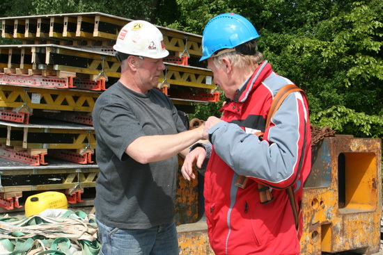 Hier helpt kraanmachinist Louis een handje met het aandoen van de veiligheidsgordel. Dat vergt nauwkeurigheid (en routine…)