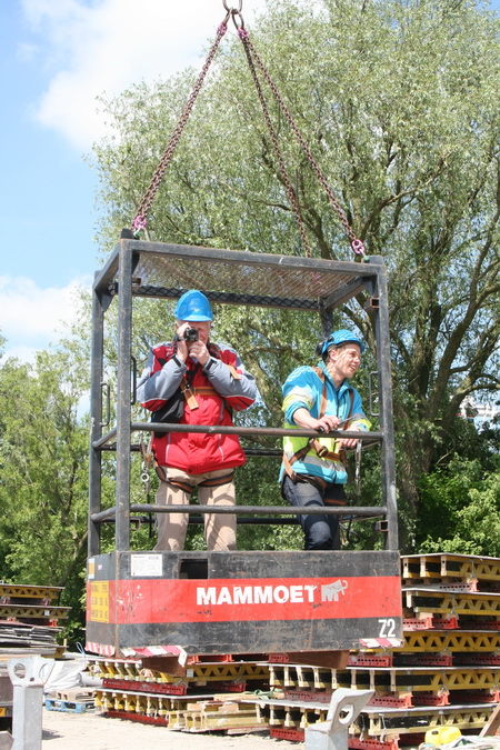 Terwijl filmer Dirk nog met zijn veiligheidsgesp staat te klooien, kijkt uitvoerder John naar buiten, alsof ze nu al tientallen meters boven de begane grond zweven… Over inlevingsvermogen gesproken!