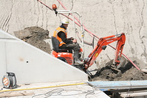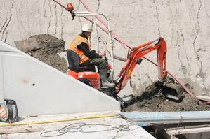 Bij die zelfde uitgang werd naast de tunnel aan de noordkant gegraven, ten behoeve van de riolering. Iemand van Loonbedrijf Mulder? Fraaie mini-grijper!