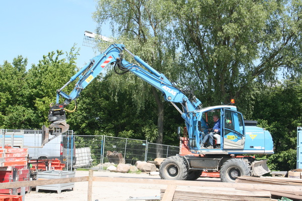 De blauwe kapitein, GMB-grijpermachinist Harrie is ook op het terrein, even een andere bak aanhaken, en weg maar weer….