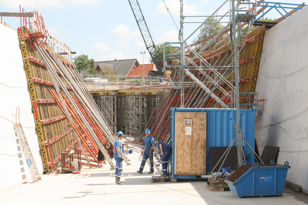 Doorkijk met zicht op de werkzaamheden van o.a. kraanmachinist Bertus die bekistingselementen verplaatst.