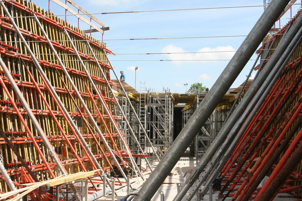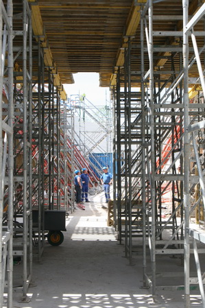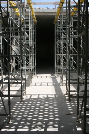 Een kunstwerk op zich… Het lichtspel tussen (en met) de stellingen die worden gebruikt voor het maken van het dek van moot 5.