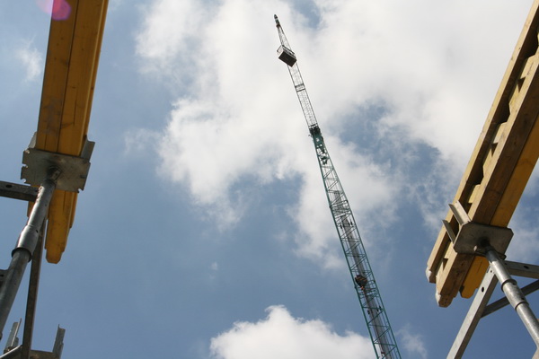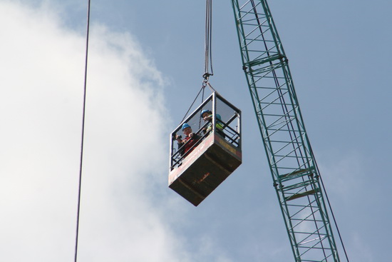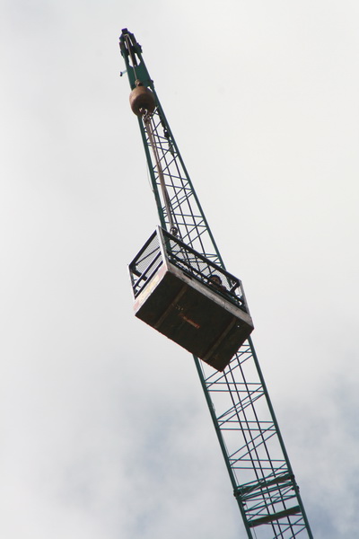Mooi beeld van de manbak, hangend in de lucht aan de kraan van machinist Louis. Met filmer Dirk Vos en uitvoerder John aan boord. Dalend….