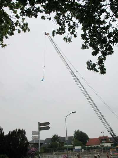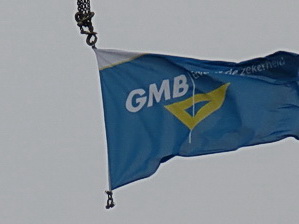 De GMB-vlag uit aan de hijskraan, ter gelegenheid van de Dag van de Bouw op 24 mei, van 10.00 tot 16.00 uur. Deze hijskraan wordt komende maandag gedemonteerd en weggebracht.
