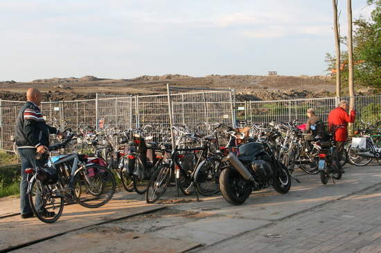 Ondanks de herhaalde verzoeken toch niet op de fiets, brommer, scooter of motor te komen, zijn er legio geïnteresseerden die dat aan hun laars hebben gelapt. En de verkeersregelaar maar bars optreden: “Fiets tussen de hekken! Anders kunnen de taxi’s niet keren of passeren!”