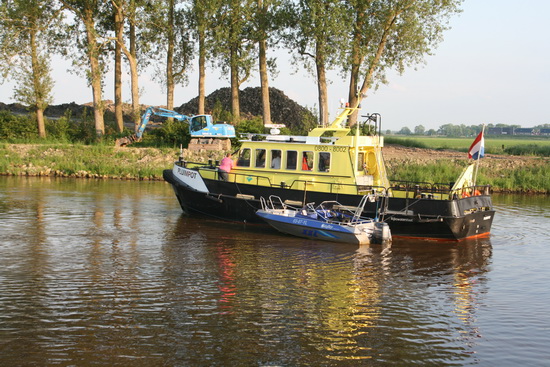 Een bekend vaartuig, de “Pluimpot”, inspectieboot van Rijkswaterstaat (standplaats Roermond), met ‘jong’…. Nee, niet bedoeld als rondvaartboot, al zal ook de Pluimpot wel enkele waterbobo’s herbergen…